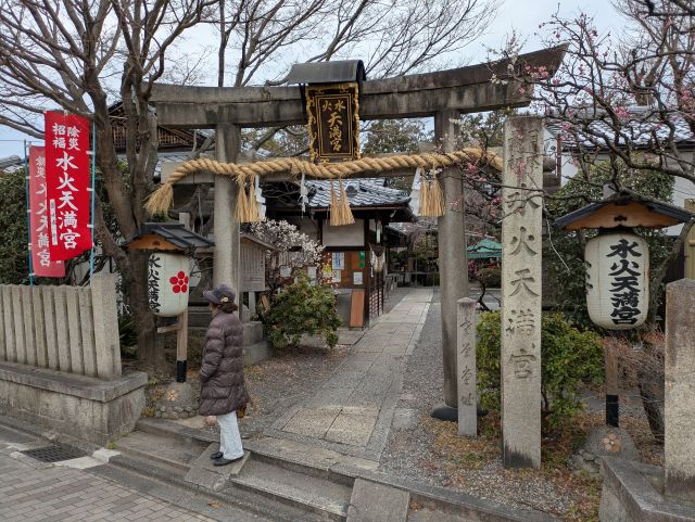水火天満宮(すいかてんまんぐう)を 訪れました。 場所は堀川通沿いで分かりやすい。 有名な道真の登天石(とうてんいし)。 梅が咲き始めていました。