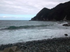 歩いて10秒で海岸。天気が悪いので荒れてマス。