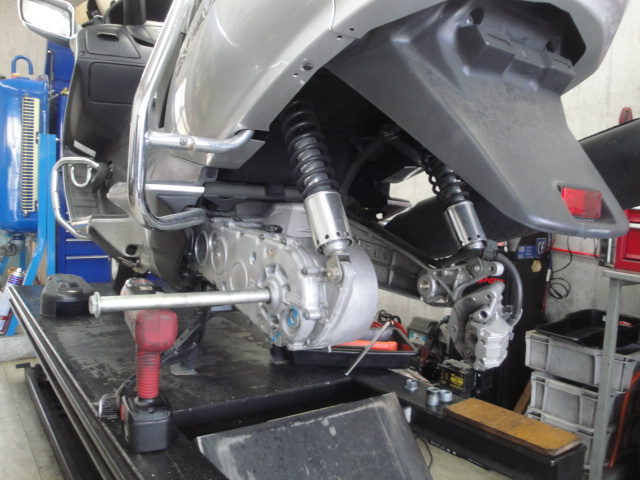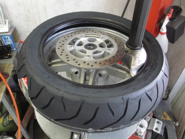 スカイウエイブ650の前後タイヤ交換を実施中。